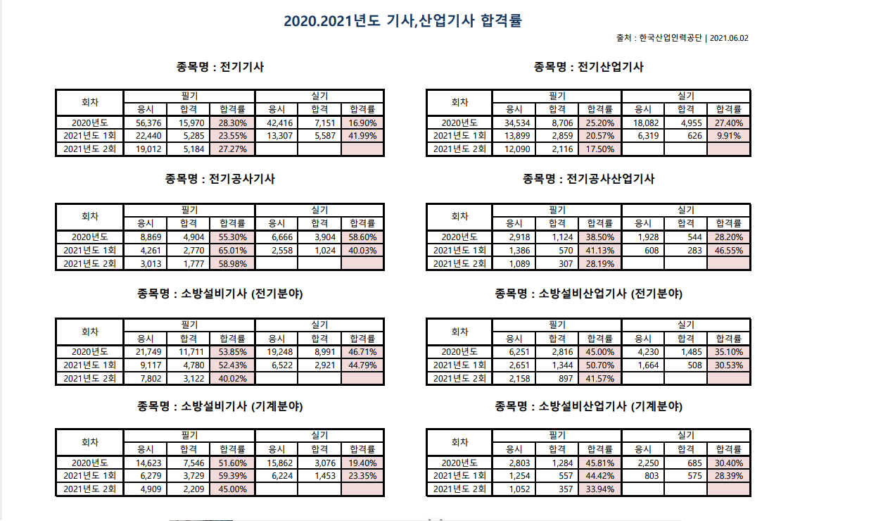 202년, 2021년도 기사, 산업기사 합격률 표 입니다.