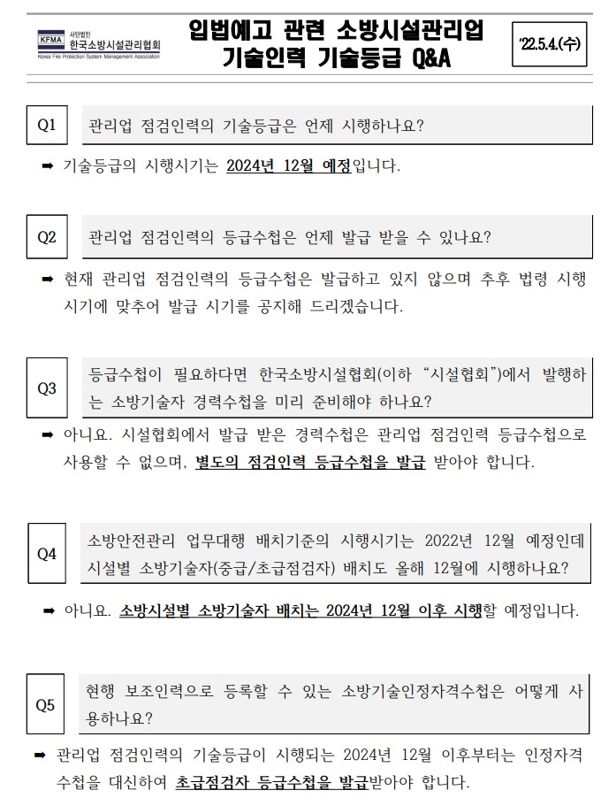 입법예고 관련 소방시설관리업 기술인력 기술등급 Q&A 내용 입니다.
